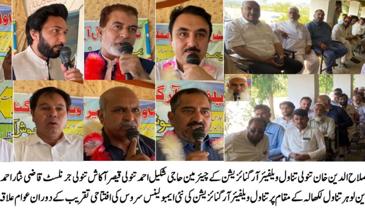 کھلابٹ (قاضی نثار احمد تنولی) تناول ویلفیئر آرگنائزیشن کے زیر اہتمام لکھالہ ایمبولینس لوئر تناول کی افتتاحی تقریب بڑے عظیم الشان جلسہ میں تبدیل حکومتی امداد کے بغیر پرائیویٹ سیکٹر میں منظم انداز سے آرگنائزیشن کو چلانے پر چیئرمین حاجی شکیل احمد تنولی اور ان کی پوری ٹیم کو خراج تحسین پیش کرتے ہیں تناول کے اندر عوام کی فلاح و بہبود کے لیے ہم سب تناول ویلفیئر آرگنائزیشن کے ساتھ فرنٹ لائن پر کھڑے ہیں ہم پر جو بھی زمہ داری سونپی جائے گی ہر ممکن نبھائیں گے لکھالہ لوئر تناول کے مقام پر ایمبولینس سروس فراہم کرنا تناول ویلفیئر آرگنائزیشن کا بہت بڑا تاریخی کارنامہ ہے جسے صدیوں تک یاد رکھا جائے گا تناول ویلفیئر آرگنائزیشن ہزارہ اور لاہور کے بعد بہت جلد کراچی اور پشاور میں بھی اپنی کامیابی کے جھنڈے گاڑھے گی ان خیالات کا اظہار مہمان خصوصی تحصیل چیئرمین اوگی نوابزادہ حسام صلاح الدین خان تنولی تناول ویلفیئر آرگنائزیشن کے چیئرمین حاجی شکیل احمد تنولی پروگرام کے آرگنائزر قیصر آکاش تنولی کھلابٹ یونین آف جرنلسٹس ہری پور کے صدر قاضی نثار احمد خان تنولی افتخار خان تنولی ایڈووکیٹ وائس چیئرمین سید فیاض شاہ، گلزیب خان تنولی کوٹھیالہ لیاقت خان تنولی معروف سنگر اعظم ہزارہ طارق خواج تنولی ٹلہالہ سردار بہادر عباسی کلنجر سمیت خواتین و دیگر مقررین نے اپنے اپنے خیالات میں کیا انھوں نے کہ تناول ویلفیئر آرگنائزیشن نے ہزارہ کی سب سے بڑی ایمبولینس سروس فراہم کرنے کا اعزاز حاصل کر لیا ہے جو کہ پوری ٹیم کی دن رات کی محنت اور عوام کے مکمل اعتماد کا اظہار و ثمر ہے جس پر تناول ویلفیئر آرگنائزیشن کی پوری ٹیم کو جتنا بھی خراج تحسین پیش کیا جائے کم ہے مقررین نے کہا تناول ویلفیئر آرگنائزیشن ایمبولینس سروس کے ساتھ ساتھ شعبہ صحت پینے کا پانی شجر کاری حادثاتی شعبہ جات میں کام کر رہی ہے بہت جلد کھلورہ کے مقام پر ہزارہ کی سب سے بڑی ہسپتال کا قیام بھی عمل میں آئے گا مقررین نے تناول ویلفیئر آرگنائزیشن کے زیر اہتمام لکھالہ ایمبولینس سروس کے آغاز اور گاڑی بطور عطیہ دینے پر علاقہ کی سماجی شخصیت قیصر آکاش تنولی شوکت خان تنولی اور ان کی پوری فیملی کو زبردست الفاظ میں خراج تحسین پیش کیا اور مبارکباد پیش کی تناول ویلفیئر آرگنائزیشن کے چیئرمین حاجی شکیل احمد تنولی نے اپنی ذاتی طرف سے قرعہ اندازی کے ذریعے شرکاء جلسہ میں سے ایک خوش نصیب کو عمرے کا ٹکٹ کا اعلان کیا تناول ویلفیئر آرگنائزیشن کے اس پروقار افتتاحی تقریب میں ڈاکٹر فدا محمد تنولی بیڑ ڈاکٹر بنارس خان تنولی کھلابٹ ساجد کریم تنولی کھلابٹ جمیل خان تنولی کھلابٹ حبیب الرحمن تنولی کھلابٹ اکبر خان تنولی کھلابٹ طارق اعوان کہنیاں یونس خان تنولی کراچی عرفات تنولی کٹنالی آفاق تنولی شیہزاد خان تنولی سرائے نعمت خان معروف صحافی شہزاد تنولی ہری پور صحافی ناصر امین ہری پور سمیت علاقہ لوہر تناول تحصیل شیروان کے بیشتر دیہات اور دور دراز علاقہ جات کے عوامی سماجی حلقوں معززین علاقہ تناول ویلفیئر آرگنائزیشن ایبٹ آباد مانسہرہ ہری پور راولپنڈی لاہور باڈیوں کے جملہ عہدے داران و ممبران کی کثیر تعداد نے شرکت کر کے افتتاحی تقریب کو بڑے جلسہ عام میں تبدیل کر دیا تقریب کے اختتام پر پروگرام کے آرگنائزر قیصر آکاش تنولی شوکت خان تنولی و دیگر نے تمام شرکاء کا شکریہ ادا کرتے ہوئے ان کی محبت خلوص کو سراہا۔