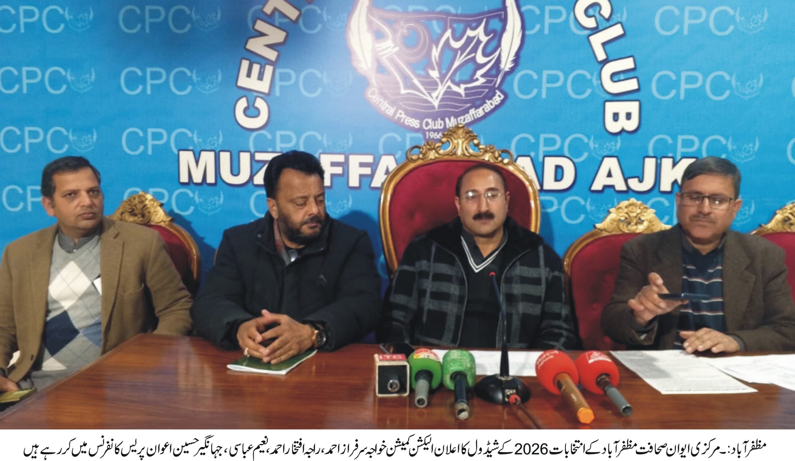 مظفرآباد مرکزی ایوان صحافت مظفرآباد کے سال 2026ء کے لیے الیکشن شیڈول کا اعلان کر دیا گیا ۔پولنگ 3فروری 2026کو بروز منگل کو ہو گی ۔مرکزی ایوان صحافت کے الیکشن کمیشن سرفراز احمد خواجہ ،راجہ افتخار احمد ،نعیم احمد عباسی ،سیکرٹری الیکشن کمیشن جہانگیر حسین اعوان کے ہمراہ پریس کانفرنس کے دوران شیڈول کا اعلان کیا ۔کاغذات نامزدگی کی وصولی 26تا 27جنوری دن دو بجے تک ،جانچ پڑتال 27جنوری 2026دن دو تا 04بجے،فیصلہ سماعت 28جنوری 2026دس تا دن دو بجے ،کاغذات نامزدگی کی حتمی فہرست 28جنوری 2026شام 04بجے تک آویزاں کر دی جائے گی جبکہ پولنگ 3فروری 2026بروز منگل صبح نو تا دن دو بجے پریس کلب ہال میں منعقد ہو گی ۔الیکشن کمیشن نے انتخابات کو شفاف بنانے کے لیے تمام تر انتظامات مکمل کر لیے گے اور ضابطہ اخلاق بھی جاری کر دیا گیا ۔