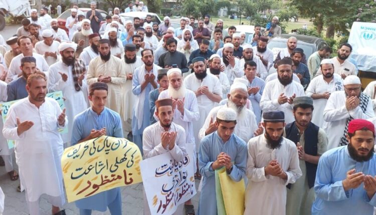 مانسہرہ (سید نعمان شاہ)سپریم کورٹ کے فیصلے کے خلاف جمعیت علماء اسلام ف کا پریس کلب مانسہرہ کے سامنے احتجاجی مظاہرہ،سپریم کورٹ کافیصلہ قادیانیوں کی سہولت کاری ہے۔مظاہرہ سے وقار الحق عثمان،مکک نوید،مولانا حفظ الرحمان، سعید عبد اللہ و دیگر مقررین کا خطاب مقررین کا کہنا تھا کہ فیصلہ دینے والے ججز اس کرسی پر بیٹھنے کے ابل نہیں ہیں۔ خاتم النین پر پوری امت مسلمہ کو سمجھوتہ منظور نہیں ہو سکتا اس ملک میں قادیانیوں کو تبلیغ کی اجازت نہیں ہے سپریم کورٹ کا فیصلہ انکی راہ ہموار کرتا ہے خاتم النین پیغمبر مصطفی محمد صلی اللہ علیہ و سلم مسلمانوں کا ایمان ہیں کسی قاضی کو شرک کے فیصلے کہ اجازت نہیں دے سکتے فیصلہ واپس نہ لیا گیا تو احتجاج کی آگ پورے ملک کو لپیٹ میں لے گی