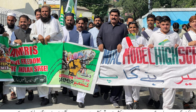 ایبٹ آباد(ہینڈ آؤٹ)05 اگست یوم استحصال کشمیر کے حوالے سے صوبائی حکومت خیبر پختونخواہ کی ہدایات کی روشنی میں ضلعی انتظامیہ بٹگرام کے زیر انتظام ضلعی سیکریٹریٹ بٹگرام سے کچہری چوک تک ریلی نکالی گئی جس میں ڈپٹی کمشنر بٹگرام آصف علی، ایڈیشنل ڈپٹی کمشنر بٹگرام، ایڈیشنل اسسٹنٹ کمشنرز،ڈی ایس پی ہیڈکوارٹر، ضلعی محکموں کے آفسران و عملہ، انجمن تاجران بٹگرام، اساتذہ،ریونیو سٹاف، ڈسٹرکٹ خطیب بٹگرام،سول سوسائٹی ممبران، طلباء اور صحافی حضرات نے شرکت کی۔ بچوں نے پاکستانی اور کشمیری پرچم اٹھائے ہوئے تھے اور کشمیریوں سے اظہار یکجہتی کیلئے ریلی بھی نکالی۔اس موقع پر ریلی شرکاء نے کہا کہ انڈیا نے جان بوجھ کر کشمیر کی خصوصی حیثیت کو بذریعہ آرٹیکل 370 /335 ختم کیا اور کشمیروں کی حقوق کو زق پہنچائی جس کی بھر پور انداز میں مذمت کی گئی۔ اس موقع پر انڈیا کے خلاف نعرہ بازی، ہاتھوں کی زنجیر اور واک کا بھی اہتمام کیا گیا اس موقع پر ڈپٹی کمشنر بٹگرام آصف علی نے انڈیا کی جانب سے کشمیروں کی حقوق مسخ کرنے پر اظہار خیال کیا اور کہا کہ وہ وقت دور نہیں جب کشمیر آزاد ہوگا، ہم اپنے کشمیری بھائیوں کے ساتھ ہیں اور انڈیا کے ہر اس اقدام کی اس وقت تک مذمت کرینگے جب تک کشمیر آزاد نہیں ہوتا ہے