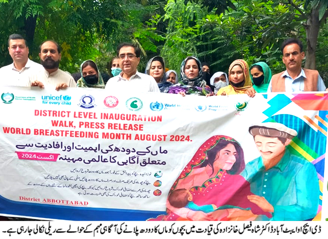 ایبٹ آباد (ہینڈ آؤٹ)پوری دنیا میں یکم اگست سے سات اگست تک بریسٹ فیڈنگ یعنی بچوں کو ماں کا دودھ پلانے کے حوالے سے آگاہی ہفتہ منایا جاتا ہے،حکومت خیبر پختونخواہ محکمہ صحت کی جانب سے صوبے بھر میں برسٹ فیڈنگ یعنی بچوں کو ماں کا دودھ پلانے کے حوالے سے آگاہی دینے کے لیے پورا مہینہ منایا جا رہا ہے, اس سلسلے میں ڈی ایچ او ایبٹ آباد افس میں ایک سیمینار انعقاد کیا گیا جس میں باقاعدہ طور پر اس مہم کا افتتاح کیا گیا.اس سیمینار کے مہمان خصوصی ڈی ایچ او ایبٹ آباد ڈاکٹر شاہ فیصل خانزادہ تھے۔انہوں نے کہا کہ بچوں کی پیدائش کے فورا بعد ماں کا دودھ پلانا شروع کر دینا چاہیے.اور چھ ماہ کی عمر تک صرف ماں کا دودھ ہی بچے کے لیے بہترین غذا ہے چھ ماہ کے بعد بچے کو ماں کے دودھ کے ساتھ ساتھ نرم اضافی غذا بھی شروع کروائیں، بیسٹ فیڈنگ یعنی بچوں کو ماں کا دودھ پلانے کے اس افتتائی سیمینار میں ڈی ایچ او ایبٹ اباد ڈاکٹر شاہ فیصل خان کے علاوہ ڈپٹی ڈی ایچ او ڈاکٹر شہزاد اقبال, ایل ایچ ڈبلیو ڈاکٹر اشفاق احمد, پروونشل مونیٹر میڈم فوزیہ، نشونما پروگرام ڈسٹرکٹ کوارڈینیٹر ایبٹ آباد ملک حسیب, نیوٹریشن ڈاکٹر لاریب، ڈی جی ہیلتھ پروونشل انفارمیشن افیسر محمد ولید، نادیہ منصف، ڈاکٹر عائشہ بخاری، ڈاکٹر ارم طاہرہ، ڈاکٹر یاسر خان، ڈاکٹر واصل اور دیگر ہیلتھ ورکرز نے شرکت کی بیسٹ فیڈنگ کے اس سیمینار کے اختتام میں بریسٹ فیڈنگ کے حوالے سے آگاہی ریلی نکالی گئی جس کی سربراہی ڈی ایچ او ڈاکٹر شاہ فیصل خانزادہ نے کی۔