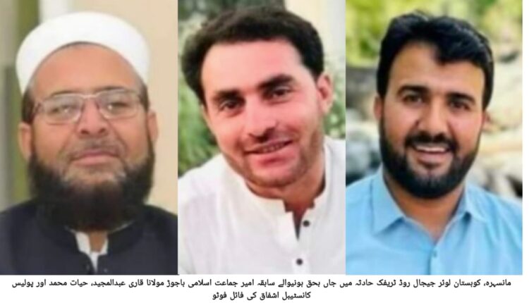 مانسہرہ(تحصیل جنرل رپورٹر+ڈسٹرکٹ نامہ نگار)قراقرم روڈ لوئر کوہستان ٹریفک حادثہ، باجوڑ جماعت اسلامی کے ضلعی امیر سمیت تین افراد جاں بحق،حادثہ گاڑی کھائی میں گرنے کے دوران پیش آیا تفصیلات کے مطابق گزشتہ روز لوئرکوہستان قراقرم روڈ پرکھوکیال جیجال کے مقام پر موٹر کار بے قابو ھونے کے دوران گہری کھائی میں جا گری جس کے نتجے میں ذرائع کے مطابق کار میں سوار تین افراد میں شامل حیات محمد ولد رحمان سید عمر32 سال سکنہ عنایت کلے باجوڑ، امان اللہ ولد عبدالخالق سکنہ صادق آباد ضلعی امیر جماعت اسلامی حادثہ باجوڑ سے گلگت جانے والی موٹر کار گاڑی ڈرائیور سے بے قابو ہوکر گہری کھاائی میں گرنے سے پیش آیا جبکہ ریسکیو1122 اور مقامی لوگوں نے امدادی کاروائیاں کرتے ہوئے 03 افراد کو نکالا مقامی ہسپتال منتقل کیا