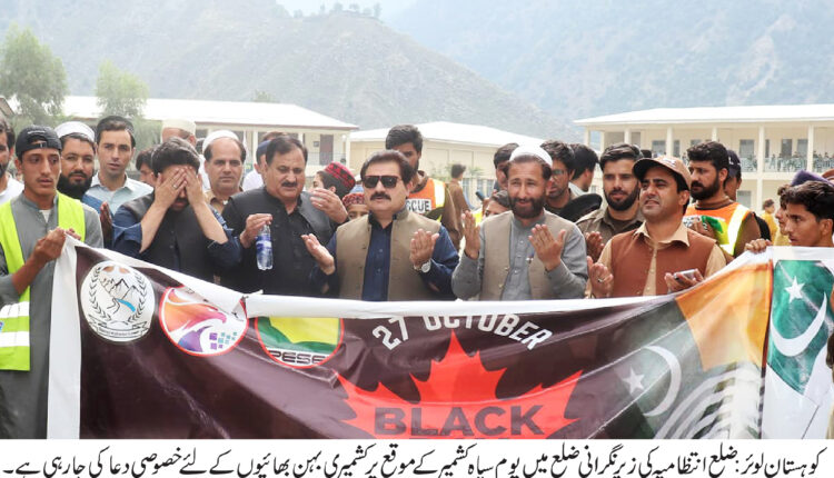 ایبٹ آباد(ہینڈ آؤٹ)صوبائی حکومت کے احکامات کی روشنی میں، ضلع کوہستان لوئر میں 27 اکتوبر کو یومِ سیاہ کشمیر کے طور پر منایا گیا۔اس موقع پر گورنمنٹ ہائی سکول پٹن میں ضلعی انتظامیہ کوہستان لوئر کی جانب سے ایک خصوصی تقریب کا انعقادکیاگیا،جس میں ضلعی افسران، پولیس کے اعلیٰ افسران، مختلف محکموں کے سربراہان، اساتذہ کرام، طلباء، معززین اور دیگر افراد نے بڑی تعداد میں شرکت کی۔تقریب کے شرکاء نے بھارت کی کشمیر میں جارحیت اور مظالم کی سخت الفاظ میں مذمت کرتے ہوئے کہا کہ 27 اکتوبر 1947 کو بھارت نے اپنی فوجیں کشمیر میں اتار کرغیرقانونی قبضہ قائم کیا جو آج تک جاری ہے۔مقررین نے مطالبہ کیا کہ مسئلہ کشمیرکو اقوامِ متحدہ کی قراردادوں کی روشنی میں حل کیاجاناچاہیے اورکہاکہ پاکستانی قوم اپنے کشمیری بھائیوں کے ساتھ کھڑی ہے۔پروگرام میں سکول کے طلباء نے یومِ سیاہ کشمیر کے حوالے سے تقاریر پیش کیں اوربھارتی مظالم کواجاگرکیا۔تقریب کے اختتام پر ڈسٹرکٹ خطیب کی قیادت میں کشمیر اورپاکستان کے لئے خصوصی دعائیں کی گئیں۔آخر میں تمام شرکاء نے کشمیر پر بھارتی مظالم کے خلاف احتجاجی واک میں شرکت کی اوربھارت کے خلاف نعرے بلند کیے