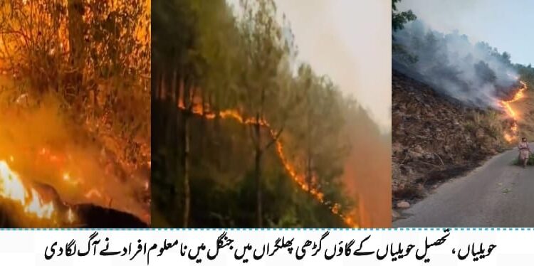تحصیل حویلیاں کے گاؤں گڑھی پھلگراں کے جنگل میں نامعلوم اشخاص نے آگ لگا دی آگ نے پورے علاقے کے جنگل کو اپنی لپیٹ میں لینا شروع کردیا اہلیان علاقہ نے متعلقہ اداروں سے مطالبہ کیاکہ اس خوفناک آگ پر اگر قابو نہ پایا گیا تو یہ آگ قریبی آبادیوں کو متاثر کرسکتی ہے مقامی افراد کے مطابق جنگل میں موجود چرند پرند جل رہے ہیں اور بعض درندہ صفت جانورجو اس جنگل میں ہیں انھوں نے آگ کی وجہ سے خود کو آگ سے محفوظ رکھنے کی خاطر آبادیوں کا رخ کرنا شروع کردیا ہے لاکھوں روپے کی عمارتی لکڑی اور ایندھن کے لیے استعمال ہونے والی لکڑ جل کر راکھ ہوگی عماہدین علاقہ نے محکمہ کے حکام سے مطالبہ کیا ہے اس خطرناک آگ پر قابو پایا جائے